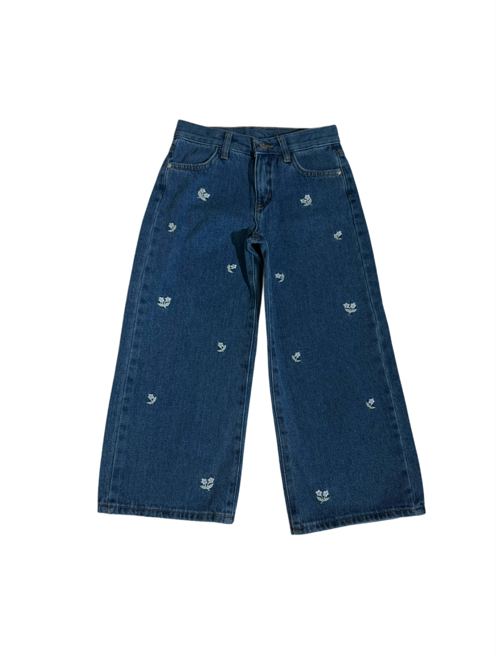 Plataus silueto džinsai su subtiliais gėlių siuvinėjimais, suteikiančiais modeliui išskirtinio žavesio. Stilingas ir lengvai derinamas modelis kasdieniams bei tvarkingesniems deriniams.