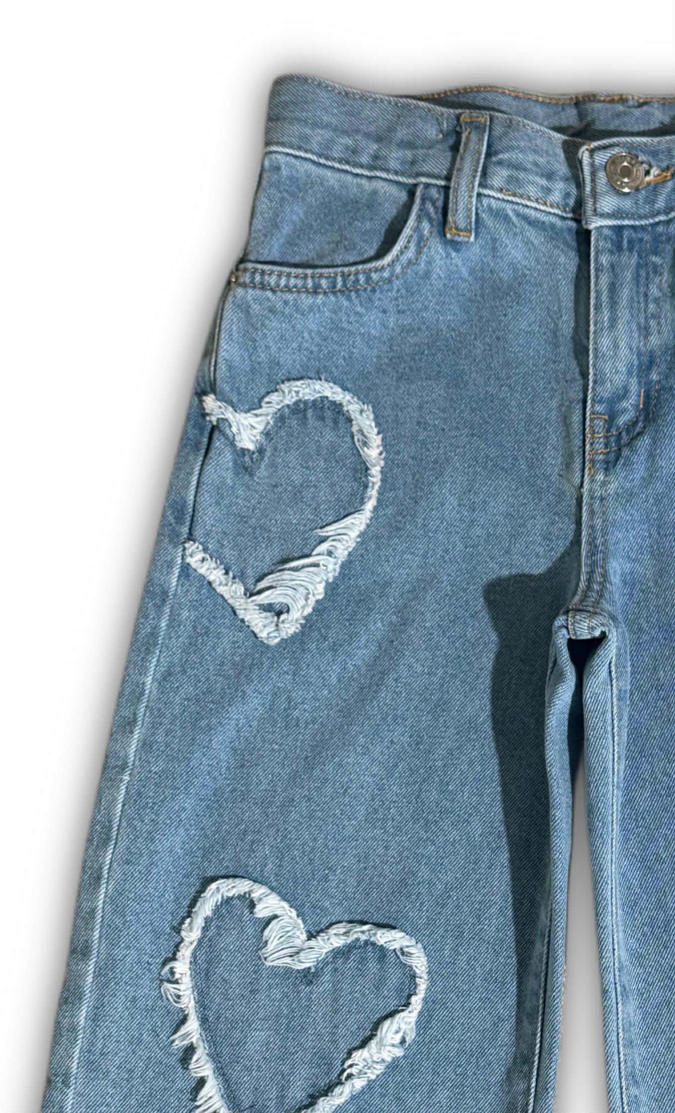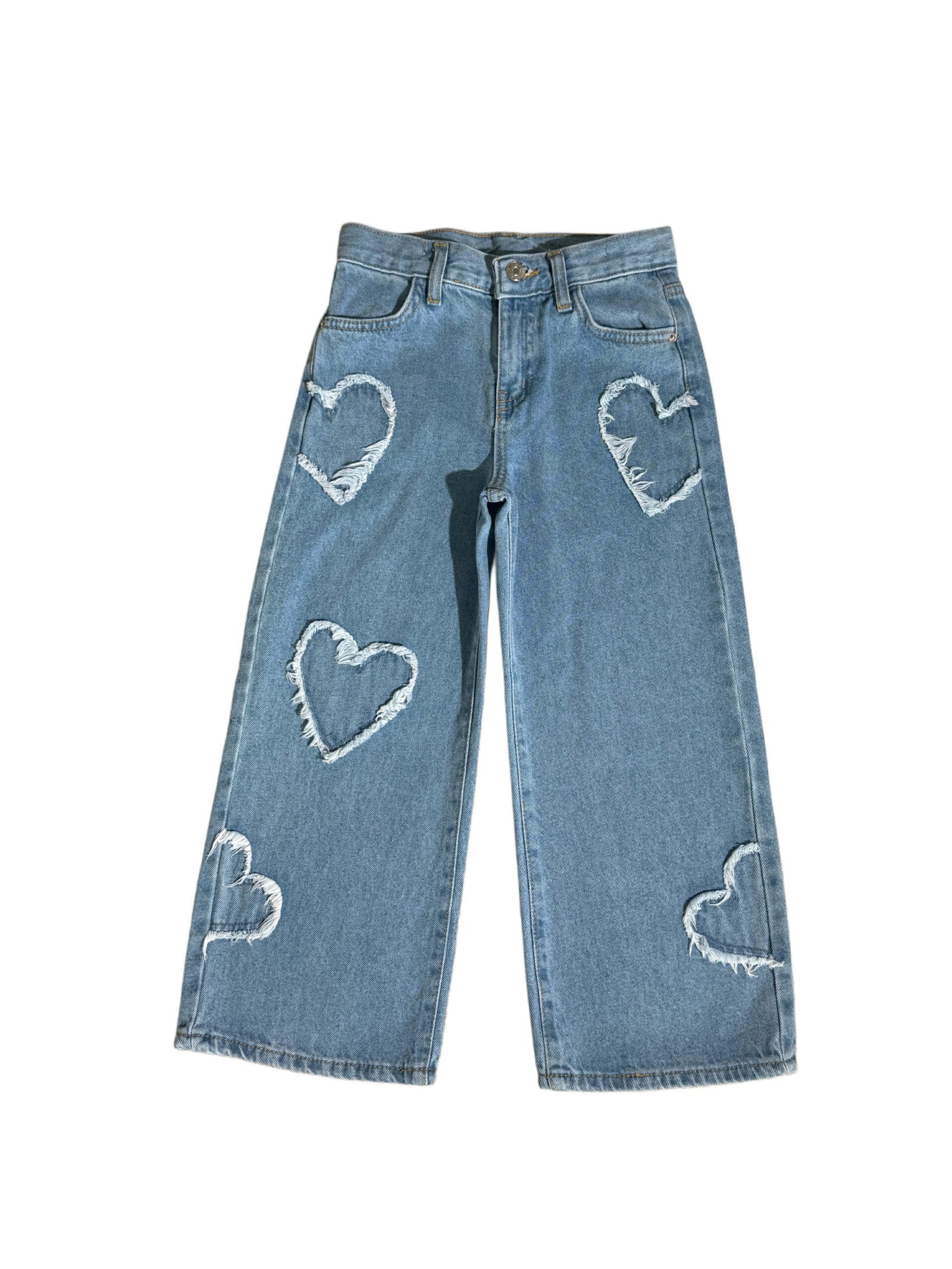 Plataus silueto džinsai su išskirtinėmis širdelių detalėmis, suteikiančiomis modeliui žaismingo akcento. Stilingas ir lengvai derinamas modelis kasdieniams deriniams.
