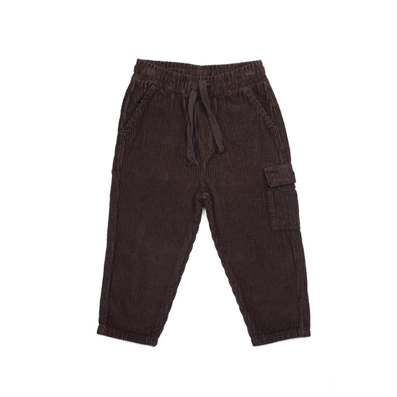 Patogios vaikiškos velvetinės kelnės su raišteliais ir šonine kišene. Minkštas audinys ir laisvesnis siluetas puikiai tinka kasdienai.