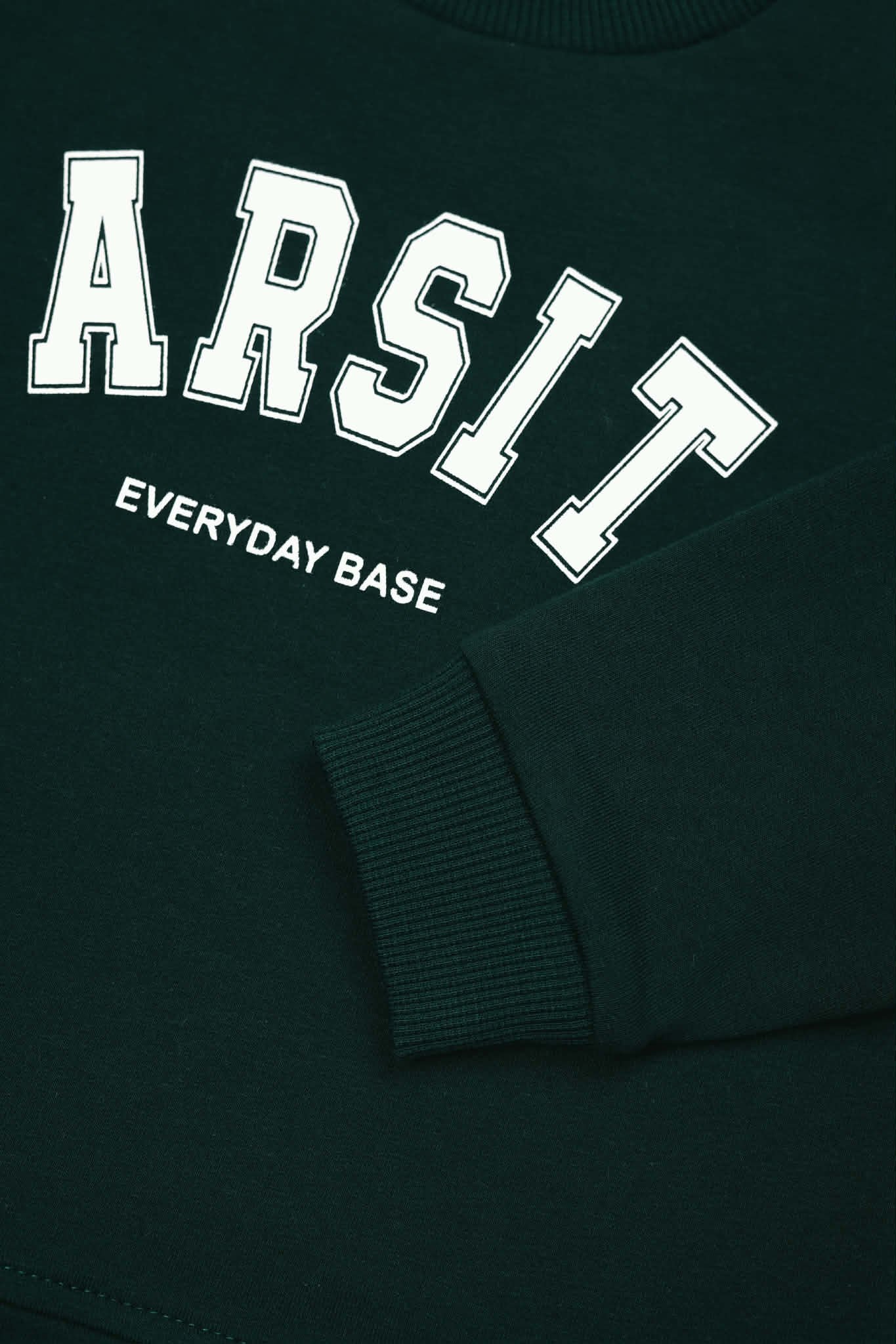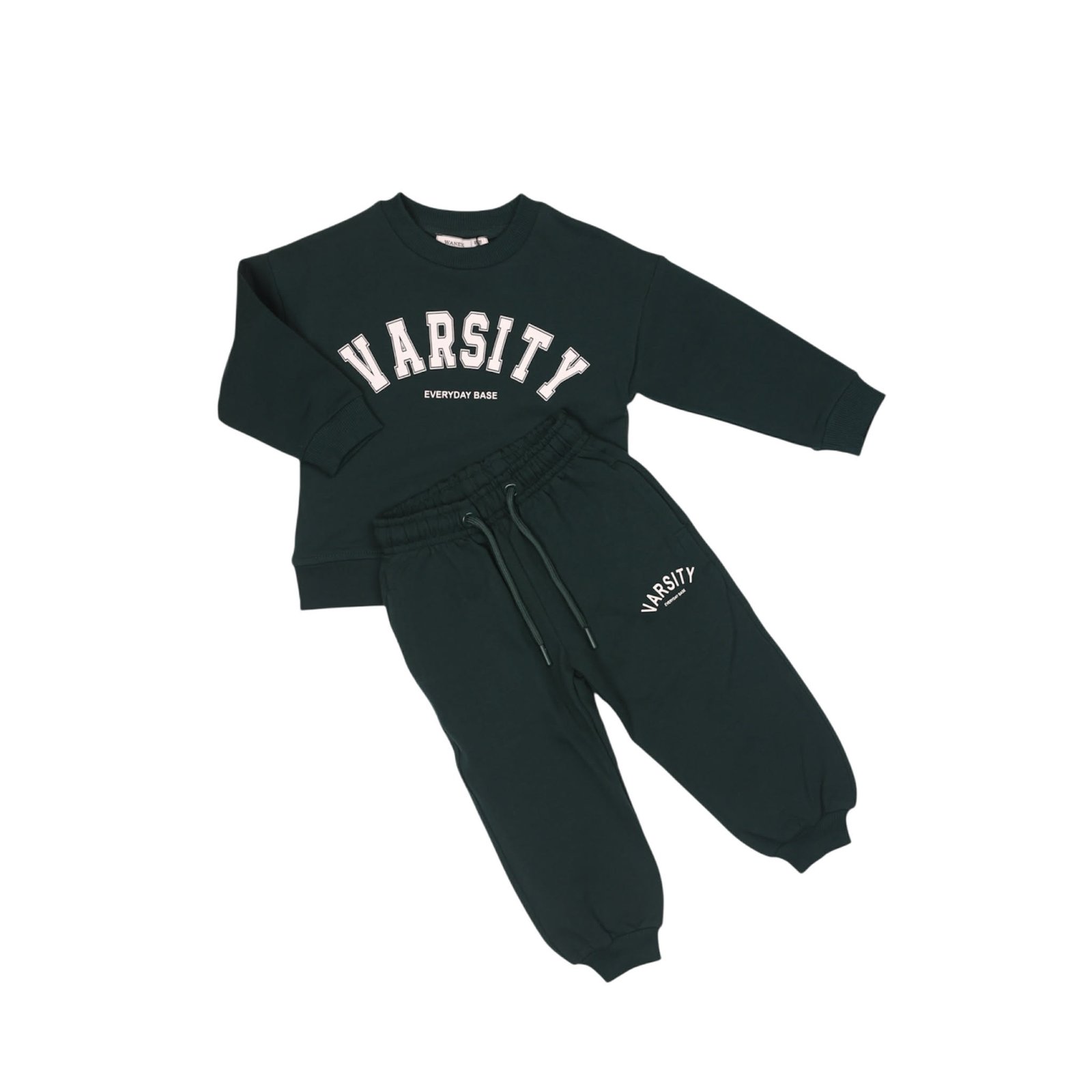 Minkšto audinio dviejų dalių kostiumas, sukurtas patogiai vaikų kasdienai.